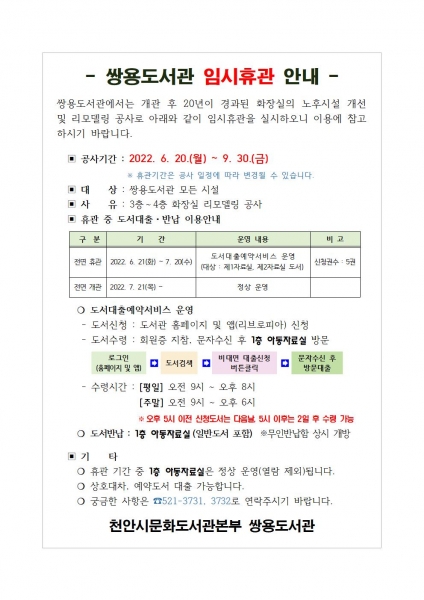 쌍용도서관은 개관 후 20년이 경과된 화장실의 노후시설 개선 및 리모델링 공사에 따라 임시휴관에 들어가고 7월 21일 전면 개관할 예정이다.