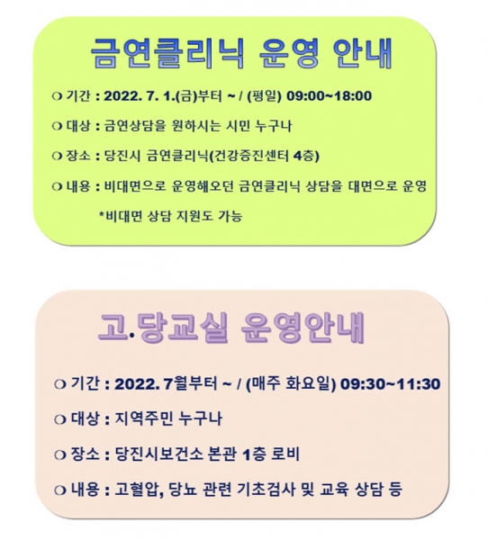 금연클리닉은 당진시보건소 4층 건강증진센터에서 평일 오전 9시부터 오후 6시까지 방문하면 되며 심뇌혈관질환 예방 및 관리를 위한 고·당교실은 보건소 1층 로비에서 매주 화요일 오전 9시 30분부터 11시30분까지 운영된다.