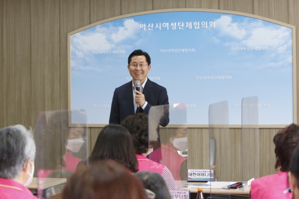 20일 아산시 여성단체협의회 6월 월례 회의를 찾은 박경귀 당선인은 “여기 모이신 여러분들을 비롯한 아산의 모든 여성과 소통하며 여성들이 우대받는, 여성들이 신명 나는 아산을 만들겠다“고 말했다.