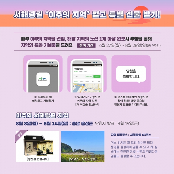 홍성군이 선정된 서해랑길‘이주의 지역’걷기 특별행사 기간은 오는 8월 8일 ~ 8월 14일까지이며 한국관광공사 두루누비 앱 설치 후, 기간 동안 서해랑길 홍성 63코스 완보 시 추첨을 통해 지역 특화 기념품을 최대 50명에게 지급한다.