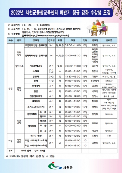 서천군, 2022년 종합교육센터 하반기 정규강좌 수강생 모집
