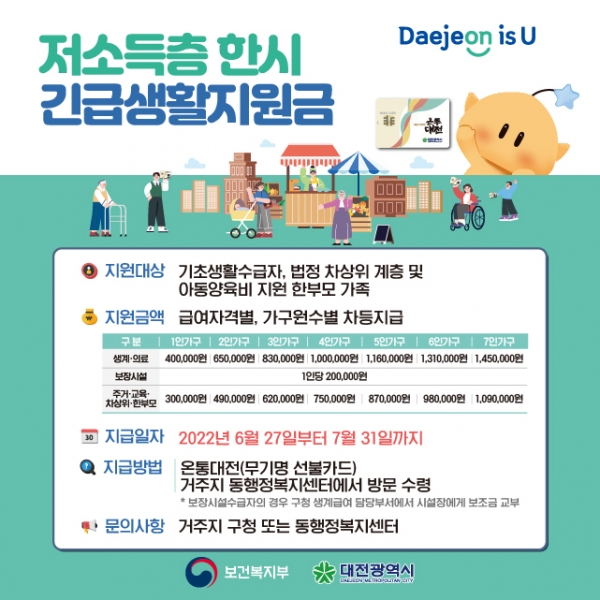 대전시, 27일부터 저소득층 한시 긴급생활지원금 지급