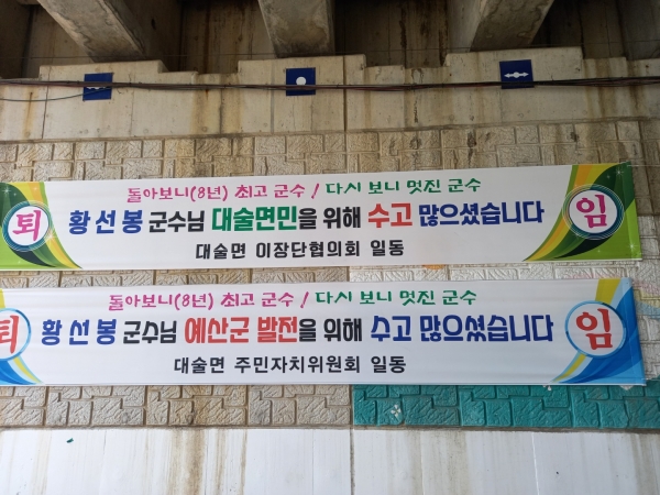 [Ytv영상스토리] 황선봉 예산군수가 이달 말 퇴임을 앞둔 가운데 예산군 지역사회 곳곳에 내걸린 현수막들이 눈길을 끌고 있다.