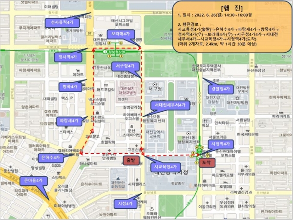 전면 통제구간은 시교육청4가~시청역4가, 관세청~시청, 시청~샘머리119안전센터 구간 등이며 시교육청4가를 출발해 은하수4가 청사역4가 보라매4가를 거쳐 시교육청4가로 되돌아오는 가두행진시에는 일부 구간이 통제될 예정이다.