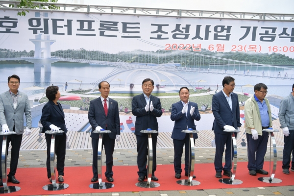 [Ytv영상스토리] 예산군은 지난 23일 예당관광지 문화광장에서 군과 유관기관 관계자 및 군민 등 100여명이 참석한 가운데 예당호 친수시설인 예당호 출렁다리와 예당호 음악분수에 이어 예당호 수변 복합 문화예술공연 공간인 예당호워터프론트 조성사업 기공식을 개최했다.