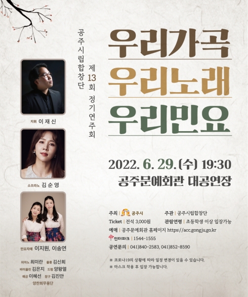 이번 공연은 초등학생 이상 입장이 가능하며 티켓은 전석 3천 원으로 공주문예회관 홈페이지를 통해 예매할 수 있다.