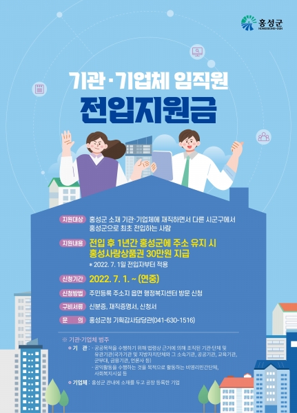 홍성군, 기관·기업체 임직원 전입지원금 신청하세요
