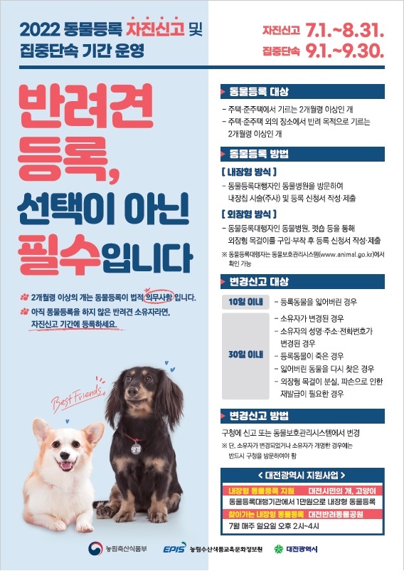 박익규 시 농생명정책과장은 “반려동물을 키우신다면 동물등록은 선택이 아닌 필수사항”이라며 “반려동물을 잃어 버렸을 경우 가장 빠르고 안전하게 찾을 수 있는 방법이 내장형으로 동물등록을 하는 것으로 이제까지 동물등록을 하지 못한 시민들께서는 이번 자진신고 기간 내 신규 등록 및 변경 신고를 해달라”고 당부했다.