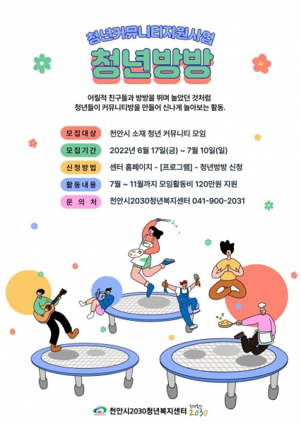 [Ytv영상스토리] 천안시는 위탁기관인 천안시2030청년복지센터가 청년문화활성화지원사업인 ‘청년방방’지원자를 7월 10일까지 모집한다고 밝혔다.