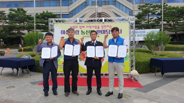 [Ytv영상스토리] 지난 27일 아산시 3개 공무원단체인 아산시공무원노동조합, 아산경찰서공무원직장협의회, 전국공무원노동조합아산소방지회와 아산시농협조합공동사업법인은 지역농산물의 소비촉진과 판매 활성화를 위한 상생 협약을 체결한 후 시청 분수대광장에서 ‘아산사랑 농산물 한마당 행사’를 성황리에 마쳤다.