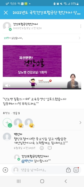 이후 네이버밴드에 접속해 각자 알맞은 시간대에 자유롭게 전문강사진이 당뇨병의 이해, 당뇨식사관리, 당뇨와 운동, 합병증 관리 방법 등을 알려주는 영상을 시청했다.