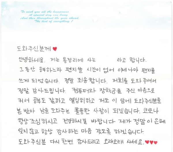 손 편지에는 후원에 대한 감사의 마음과 후원자님과 같이 앞으로 남을 도와주는 훌륭한 사람이 되겠다는 당찬 포부가 정성스럽게 담겼다.
