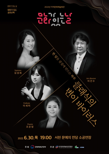이번 공연은 강북청소년교향악단 이건수 예술감독의 해설과 함께 서천필하모닉오케스트라의 라이브 연주와 바이올리니스트 이세미, 소프라노 김성희, 피아니스트 조은영의 연주가 진행된다.