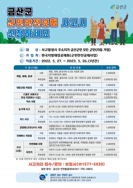 군 관계자는 “금산군민의 귀중한 인명을 보호하기 위해 군민안전보험이 운영되고 있다”며 “사고로 피해를 받은 주민은 지급 신청을 해주시길 당부드린다”고 말했다.