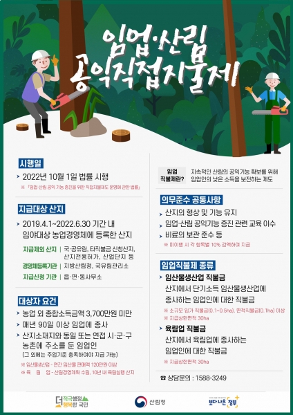이번에 지급되는 임업직불금은 임업·산림의 공익기능을 증진하고 임업의 낮은 소득을 보전하기 위해 올해부터 자격을 갖춘 임업인에게 지급되는 제도이다.