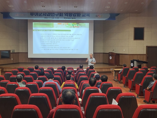 [Ytv영상스토리] 부여군은 지난 1일 농업기술센터 대강당에서 사과 연구회원 60명을 대상으로 품목조직 활성화와 사과 재배기술 다변화를 위한 ‘부여군사과연구회’ 역량강화 교육을 추진했다.