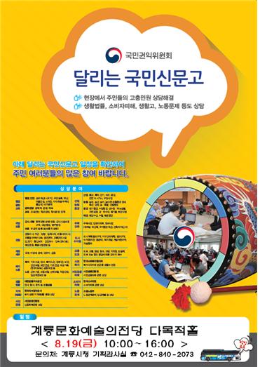 이번에 진행되는 달리는 국민신문고는 계룡시, 논산시, 대전시 유성구 주민도 참여할 수 있으며 행정, 부패신고 생활법률, 사회복지, 노동, 소비자 피해구제 등 국민권익위원회에서 각 분야별로 구성한 전문조사관과 협업기관 및 상담관이 상담을 진행한다.