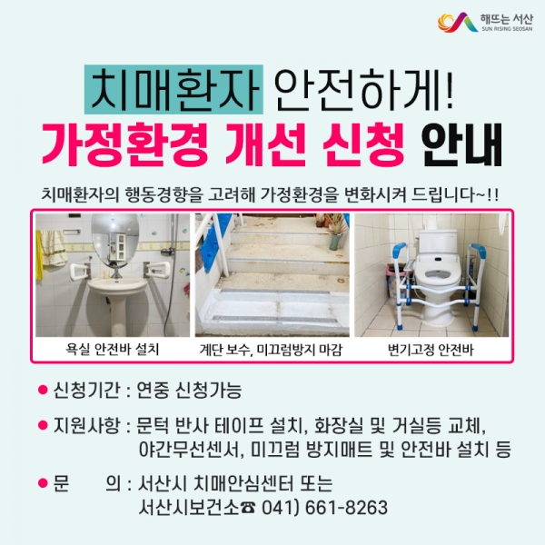 이에 시는 치매환자의 가정 내 낙상 방지를 위한 문턱 반사 테이프 설치, 화장실 및 거실등, 미끄럼 방지매트 및 안전바 설치 등을 지원한다.