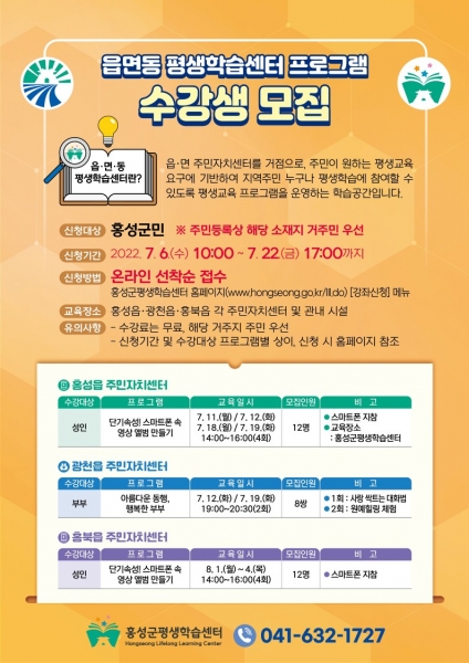 수강 신청은 홍성군평생학습센터 홈페이지에서 온라인 접수만 가능하며 오는 7월 6일 10시부터 22일 오후 5시까지 프로그램별로 상이하게 진행된다.