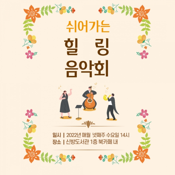 신방도서관 관계자는 “삶에 지친 시민들이 잠시나마 음악으로 마음을 치유하고 힐링의 시간을 갖길 바라는 마음으로 준비했다”며 “전문 연주가와 예술가들의 무대를 눈앞에서 볼 수 있는 좋은 기회가 될 것”이라고 말했다.