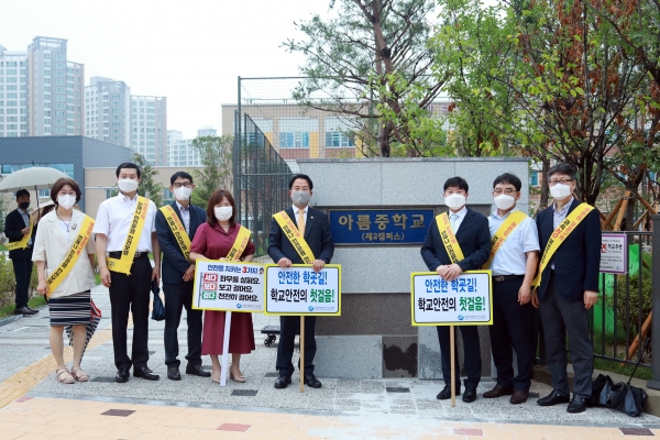 이날 상병헌 의장은 아름중학교 제2캠퍼스 정문에서 ‘안전한 학굣길, 학교안전의 첫걸음’이라고 적힌 팻말을 앞에 놓고 등교하는 학생들에게 인사를 건네며 통학로 안전 점검과 지도에 힘을 보탰다.