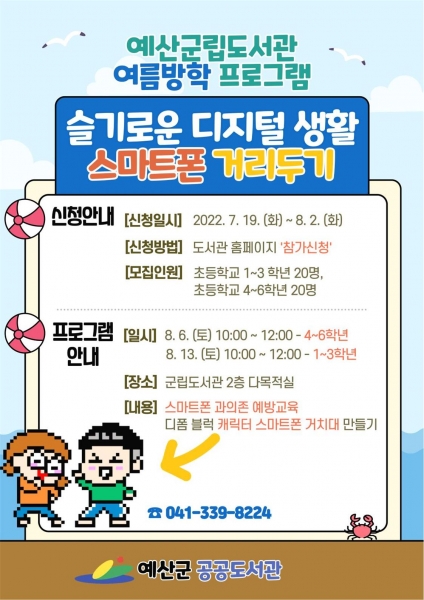 [Ytv영상스토리] 예산군립도서관은 8월 6일과 13일 관내 초등학생을 대상으로 여름방학 프로그램인 스마트폰 과의존 예방교육, ‘슬기로운 디지털 생활, 스마트폰 거리두기’를 운영한다.