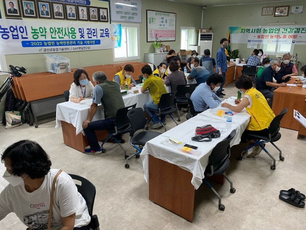 군은 단국대병원 충남농업안전보건센터와 함께 지난 12일 추부면깻잎연구회 사무실에서 GAP깻잎연구회 회원 25명을 대상으로 농약노출 정도 검사를 추진했다.
