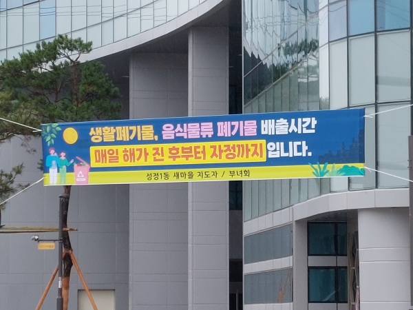 현수막에는 ‘생활폐기물·음식물류 폐기물 배출시간, 매일 해가 진 후부터 자정까지이다’라는 문구가 적혀있어 누구나 쉽게 쓰레기 배출시간을 알 수 있도록 했으며 앞으로도 동은 자생단체원들과 지속적인 주민 계도 활동을 추진할 방침이다.