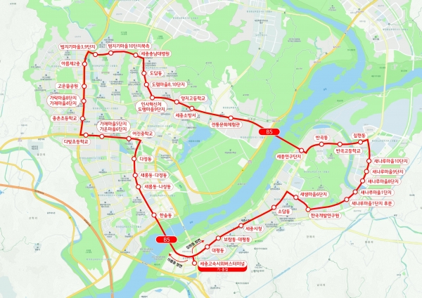 이에 따라 기존 B5번 운행경로인 세종터미널~종촌동~아름동~누리동~소담동~보람동~세종터미널 노선이 세종터미널~아름동~도담동~반곡동~집현동~소담동~보람동~세종터미널 노선으로 확대 변경된다.