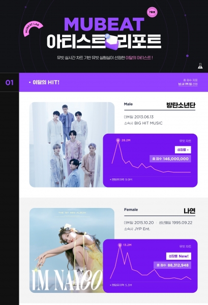 글로벌 팬덤 플랫폼 뮤빗 팬덤실험실이 발표한 아티스트 리포트 7월 호에 따르면 11개월 만에 신곡 ‘옛 투 컴’을 발표한 BTS와 걸그룹 트와이스에서 첫 솔로 주자로 나선 나연이 ‘이달의 HIT 아티스트’로 선정됐다.