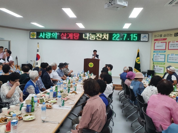 이날 행사는 어르신들을 위한 축하공연과 참석 내빈의 인사말씀, 새마을회원들이 정성껏 준비한 삼계탕을 대접하는 순서로 진행됐다.