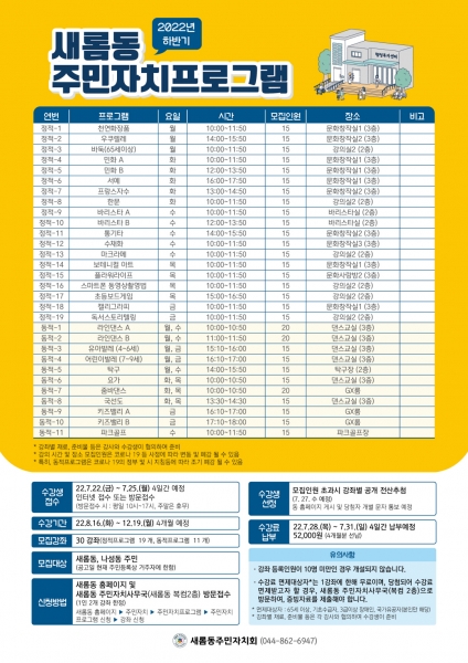 [Ytv영상스토리] 세종특별자치시 새롬동 주민자치회가 오는 22일부터 25일까지 ‘2022년 하반기 주민자치프로그램’ 수강생을 모집한다.