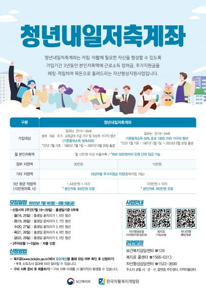 임동신 사회복지과장은 “경제적 어려움을 겪는 청년들의 목돈 마련 기회인 ‘청년내일저축계좌’ 가입을 위해 적극적 행정지원을 펼칠 것”이라며 “근로활동을 하는 관내 청년들이 가입 신청하기를 바란다”고 전했다.
