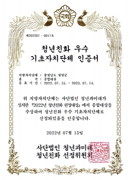 [Ytv영상스토리] 농촌형 청년정책 추진에 역량을 집중하고 있는 청양군이 '2022 청년친화헌정대상' 종합대상을 수상하면서 청년친화 우수 지자체로 선정됐다고 19일 밝혔다.