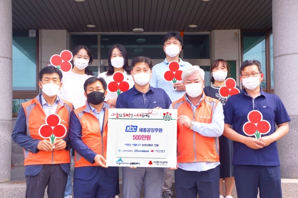 이번 사업은 KCC세종공장에서 500만원을 후원해 세종사회복지공동모금회를 통해 관내 노인 100명에게 농협상품권 5만원 권을 지원하는 게 골자다.