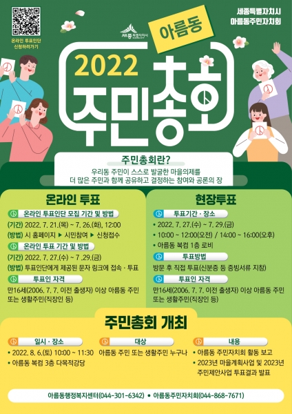 오는 27일부터 29일까지 투표참여 안내문자 링크를 통해 온라인 투표에 참여할 수 있으며 온라인으로 투표가 어려운 주민은 동일 기간 아름동 복합커뮤니티센터 1층에서 현장투표도 가능하다.