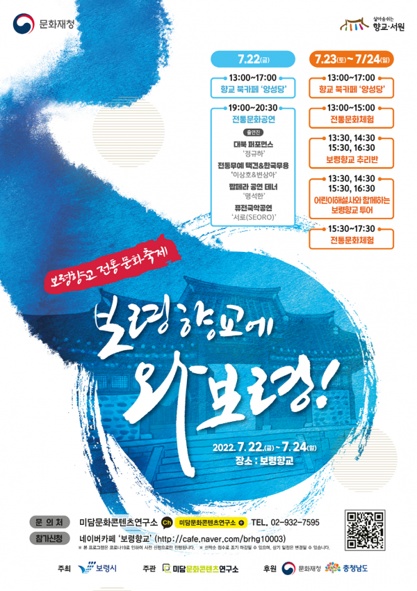 이번 행사에는 ‘보령향교에 와보령’의 꽃이라고 할 수 있는 ‘날 좀 보령’ 전야제 문화예술 공연을 시작으로 향교 북카페 ‘양성당’, 미션 어드벤처 ‘보령향교 추리반’등 많은 볼거리와 즐길 거리가 준비되어 있다.