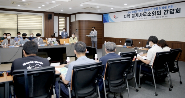 군은 지난 21일 군청 중회의실에서 가세로 군수 및 산업건설국장 등 군 관계자와 관내 설계사무소 관계자, 국립공원공단태안해안사무소·한국국토정보공사·태안소방서 관계자 등 30여명이 참석한 가운데 ‘지역 설계사무소와의 간담회’를 개최했다고 밝혔다.