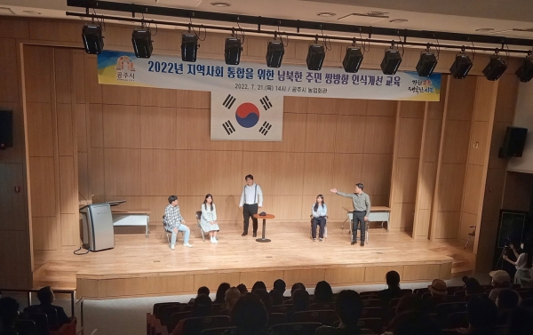 이날 교육은 공주시가족센터에서 다문화 인식개선 및 상호문화 이해 교육 강사 활동을 하고 있는 관내 거주 북한이탈주민이 직접 강의를 진행했으며 이어 남북 커플 회담이라는 주제로 공감 연극을 선보였다.