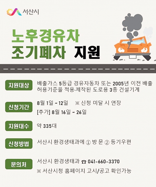 25일 시에 따르면 이번 사업은 상반기 조기폐차 지원사업을 신청하지 못한 민원인들의 추가 사업 요청으로 상반기 사업 잔여 예산을 활용해 추진된다.