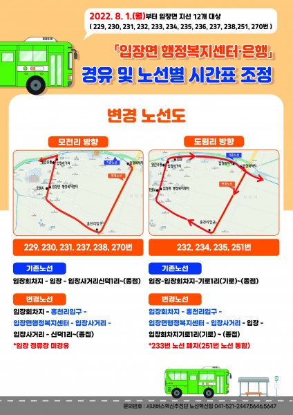 주요 개편내용은 입장면 지선버스가 입장면 행정복지센터, 시장, 병원, 은행 등 주요 생활 중심지를 경유하도록 개선해 주민들의 행정·금융 서비스 이용 편의를 향상한 점이다.