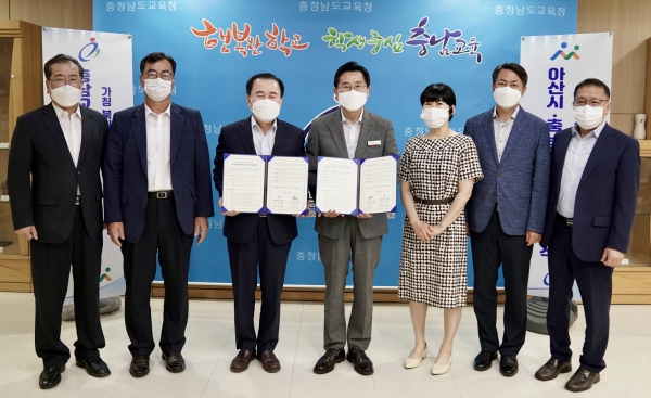 이날 아산시는 둔포 지역에 가칭 북아산고 2025년 개교를 위해 학교용지 매입비 전액 지원, 학교 진입로 개설 등 지원을 위해 상호 업무협약을 체결하고 올해 10월 교육부와 행안부의 공동재정투자심사에 공동 대응하기로 상호 협의했다.
