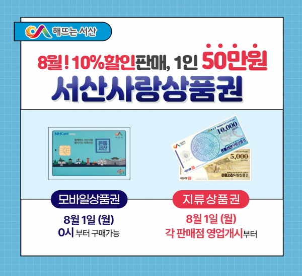 서산시, 8월부터 서산사랑상품권 구매한도 상향