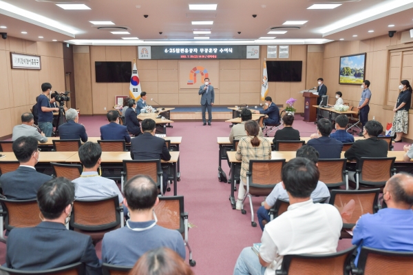 최원철 시장은 “이근섭 소위님의 가슴에 훈장을 직접 달아드리고 싶었으나 건강상의 이유로 참석하지 못해 아쉽다 나라를 위해 희생하고 헌신한 유공자와 보훈 가족들에 대한 존경과 예우를 위해 노력하겠다“고 말했다.