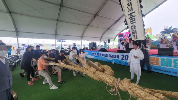 지난달 16일 개막해 이달 15일까지 운영하는 보령해양머드박람회에 당진시는 단독으로 홍보관을 운영, 지역의 브랜드와 관광자원을 홍보하고 있으며 이에 더해 시는 지역 대표 무형유산인 기지시줄다리기를 관광객에게 체험할 수 있는 기회를 제공하고자 시연 행사를 진행했다.
