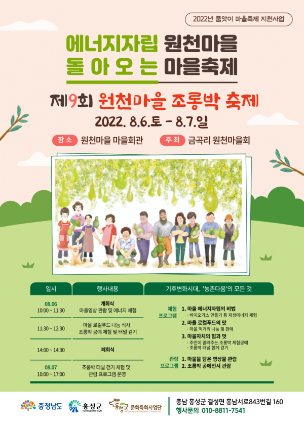 홍성군 문화특화사업단의 품앗이마을 지원사업으로 열리는 이번 원천마을 조롱박 축제는 마을회관 앞에 조성한 110m 길이의 조롱박터널을 활용해 에너지자립 마을의 특성을 살린 축제이다.