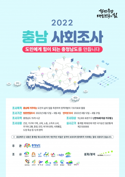 충청남도 사회조사는 충남도민의 삶의 질과 전반적인 복지 수준을 파악해 사회 변화 예측, 각종 정책 수립 및 방향 설정을 위한 기초자료로 활용할 목적으로 매년 시행되고 있다.