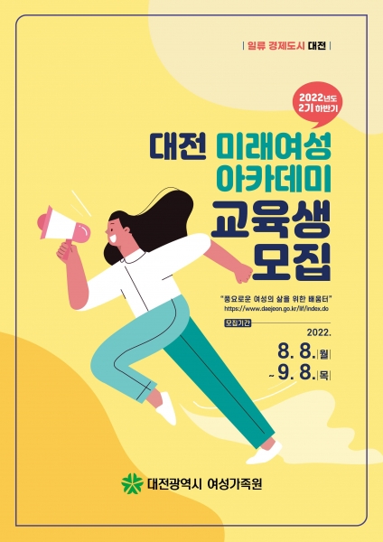[Ytv영상스토리] 대전시 여성가족원은 오는 8일부터‘2022년 하반기 대전 미래여성아카데미’교육생 100명을 모집한다고 4일 밝혔다.