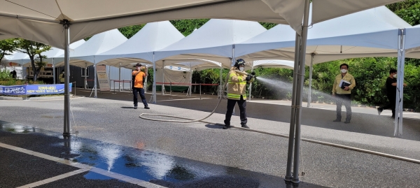 이와 함께 아산소방서 협조로 선별진료소 살수 작업도 수시로 진행하고 있다.