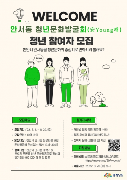 도는 천안 안서동 대학가 및 천호지 주변을 청년문화의 중심인 대학로로 조성하기 위한 첫 단계로 오는 20일까지 ‘안서동 청년문화발굴회’ 참여 청년 10명을 모집한다고 8일 밝혔다.